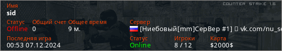 Играет на Counter Strike 1.6 сервере. Страна: РоссияПервый раз замечен 20:35 04.11.2024