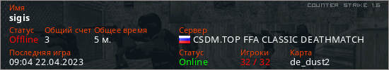 Играет на Counter Strike 1.6 сервере. Страна: РоссияПервый раз замечен 08:51 22.04.2023