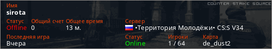 Играет на Counter Strike Source сервере. Страна: РоссияПервый раз замечен 15:38 06.12.2025