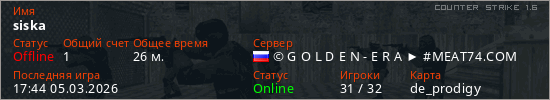 Играет на Counter Strike 1.6 сервере. Страна: РоссияПервый раз замечен 15:33 27.02.2026