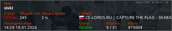 Играет на Counter Strike 1.6 сервере. Страна: РоссияПервый раз замечен 07:23 13.09.2020