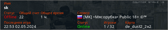 Играет на Counter Strike 1.6 сервере. Страна: РоссияПервый раз замечен 18:19 15.06.2023