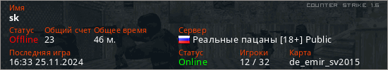 Играет на Counter Strike 1.6 сервере. Страна: РоссияПервый раз замечен 00:24 18.01.2024