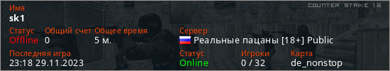 Играет на Counter Strike 1.6 сервере. Страна: РоссияПервый раз замечен 23:16 29.11.2023