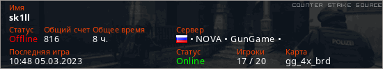 Играет на Counter Strike Source сервере. Страна: РоссияПервый раз замечен 18:40 04.02.2023