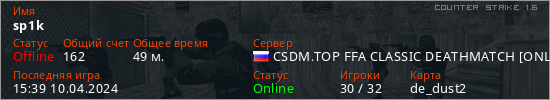 Играет на Counter Strike 1.6 сервере. Страна: РоссияПервый раз замечен 15:56 08.04.2023