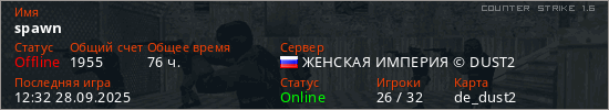 Последний раз был в сети 12:32 28.09.2025 Игрок с таким ником замечен на 24 серверах