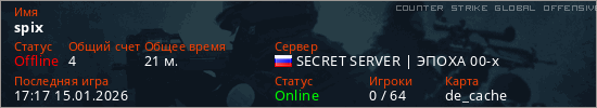Играет на Counter Strike Global Offensive сервере. Страна: РоссияПервый раз замечен 20:42 28.12.2025