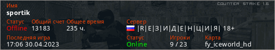 Играет на Counter Strike 1.6 сервере. Страна: РоссияПервый раз замечен 13:26 15.07.2019