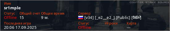 Играет на Counter Strike Source сервере. Страна: РоссияПервый раз замечен 19:10 17.09.2025