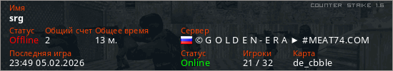 Играет на Counter Strike 1.6 сервере. Страна: РоссияПервый раз замечен 14:53 06.01.2026