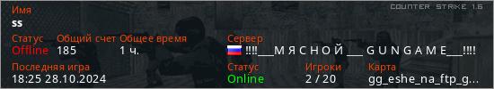 Играет на Counter Strike 1.6 сервере. Страна: РоссияПервый раз замечен 19:48 13.07.2022