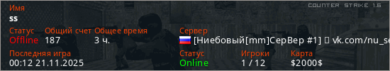 Играет на Counter Strike 1.6 сервере. Страна: РоссияПервый раз замечен 12:00 12.10.2021