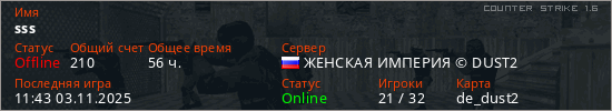 Играет на Counter Strike 1.6 сервере. Страна: РоссияПервый раз замечен 21:14 06.09.2021