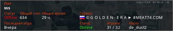 Играет на Counter Strike 1.6 сервере. Страна: РоссияПервый раз замечен 05:46 01.02.2023