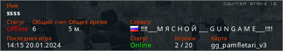 Играет на Counter Strike 1.6 сервере. Страна: РоссияПервый раз замечен 13:57 20.01.2024