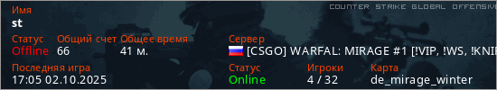 Играет на Counter Strike Global Offensive сервере. Страна: РоссияПервый раз замечен 12:59 26.09.2025