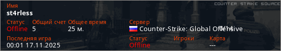 Играет на Counter Strike Source сервере. Страна: РоссияПервый раз замечен 18:04 24.10.2025