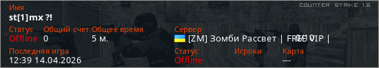 Играет на Counter Strike 1.6 сервере. Страна: УкраинаПервый раз замечен 12:37 14.04.2026