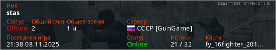 Играет на Counter Strike 1.6 сервере. Страна: РоссияПервый раз замечен 12:01 12.03.2024