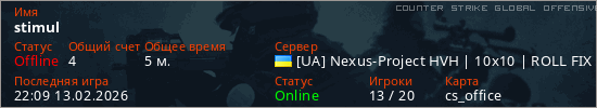 Играет на Counter Strike Global Offensive сервере. Страна: УкраинаПервый раз замечен 22:07 13.02.2026