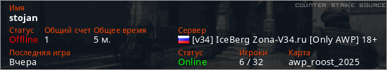 Играет на Counter Strike Source сервере. Страна: РоссияПервый раз замечен 18:44 09.03.2026