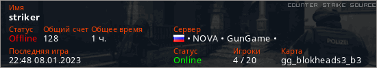 Играет на Counter Strike Source сервере. Страна: РоссияПервый раз замечен 15:15 23.09.2022