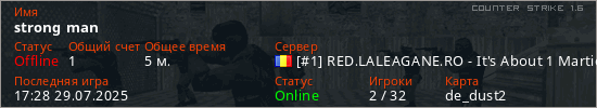 Играет на Counter Strike 1.6 сервере. Страна: РумынияПервый раз замечен 17:14 29.07.2025