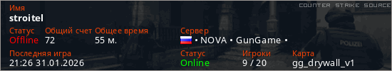 Играет на Counter Strike Source сервере. Страна: РоссияПервый раз замечен 18:03 24.01.2026
