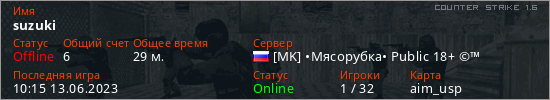 Играет на Counter Strike 1.6 сервере. Страна: РоссияПервый раз замечен 13:29 14.05.2023