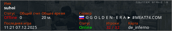 Играет на Counter Strike 1.6 сервере. Страна: РоссияПервый раз замечен 23:50 20.02.2025