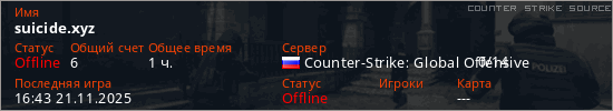 Играет на Counter Strike Source сервере. Страна: РоссияПервый раз замечен 17:24 04.11.2025