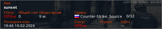 Играет на Counter Strike Source сервере. Страна: РоссияПервый раз замечен 19:20 10.02.2026