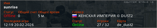 Играет на Counter Strike 1.6 сервере. Страна: РоссияПервый раз замечен 12:15 20.02.2026