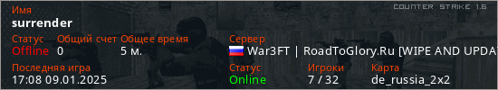 Играет на Counter Strike 1.6 сервере. Страна: РоссияПервый раз замечен 16:57 09.01.2025