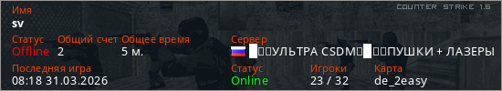 Играет на Counter Strike 1.6 сервере. Страна: РоссияПервый раз замечен 08:14 31.03.2026