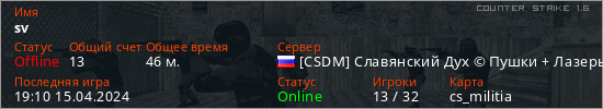 Играет на Counter Strike 1.6 сервере. Страна: РоссияПервый раз замечен 22:56 12.04.2024
