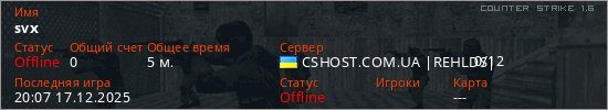 Играет на Counter Strike 1.6 сервере. Страна: УкраинаПервый раз замечен 19:59 17.12.2025