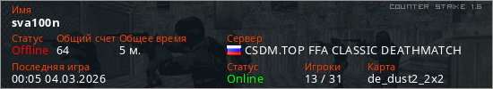 Играет на Counter Strike 1.6 сервере. Страна: РоссияПервый раз замечен 23:48 03.03.2026