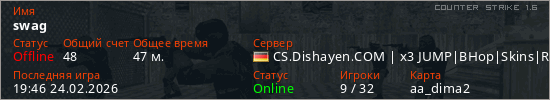 Последний раз был в сети 19:46 24.02.2026 Игрок с таким ником замечен на 34 серверах