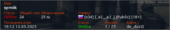 Играет на Counter Strike Source сервере. Страна: РоссияПервый раз замечен 19:10 12.05.2025