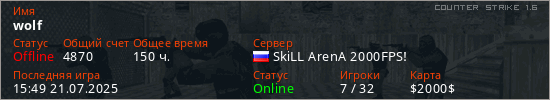 Играет на Counter Strike 1.6 сервере. Страна: РоссияПервый раз замечен 20:03 08.11.2022