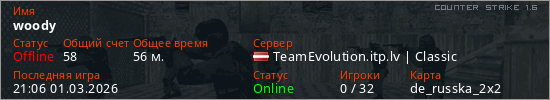 Играет на Counter Strike 1.6 сервере. Страна: ЛатвияПервый раз замечен 23:04 26.02.2026