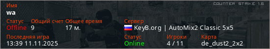 Играет на Counter Strike 1.6 сервере. Страна: РоссияПервый раз замечен 04:50 30.09.2024