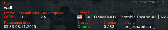 Играет на Counter Strike 1.6 сервере. Страна: СШАПервый раз замечен 03:29 25.09.2025