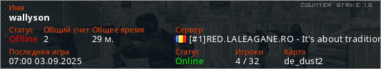 Играет на Counter Strike 1.6 сервере. Страна: РумынияПервый раз замечен 00:09 17.08.2025