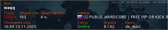 Играет на Counter Strike Global Offensive сервере. Страна: РоссияПервый раз замечен 11:07 15.10.2025