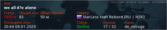 Играет на Counter Strike Global Offensive сервере. Страна: РоссияПервый раз замечен 12:16 04.01.2026
