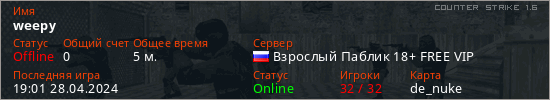 Играет на Counter Strike 1.6 сервере. Страна: РоссияПервый раз замечен 18:37 28.04.2024