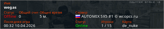Играет на Counter Strike 1.6 сервере. Страна: РоссияПервый раз замечен 00:27 10.04.2026